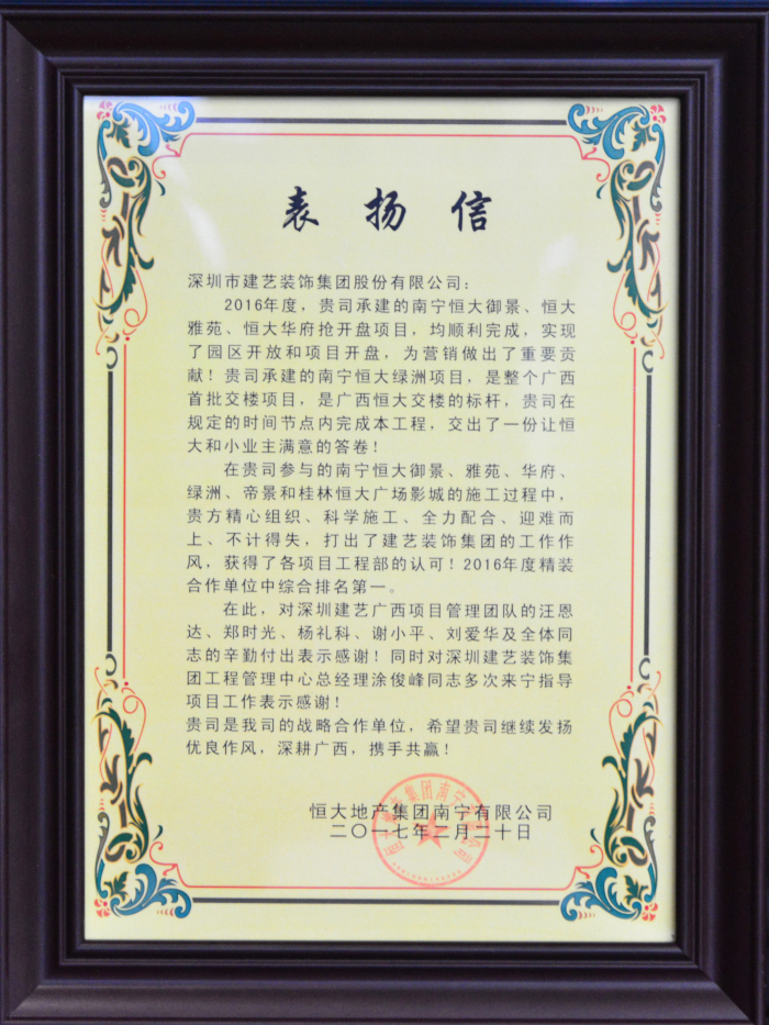 在我司參與的南寧恒大御景、南寧恒大雅苑、南寧恒大華府、南寧恒大綠洲、南寧恒大帝景和桂林恒大廣場影城等項目的施工過程中,我司工程管理人員精心組織、科學(xué)施工、全力配合、迎難而上,充分展現(xiàn)了建藝人的工作作風(fēng),得到了恒大南寧公司上下的一致認(rèn)可及表彰,榮獲 “2016年度精裝合作單位綜合排名第一”、 “優(yōu)秀合作單位”等榮譽獎牌及表揚信,為建藝集團(tuán)贏得了榮譽!