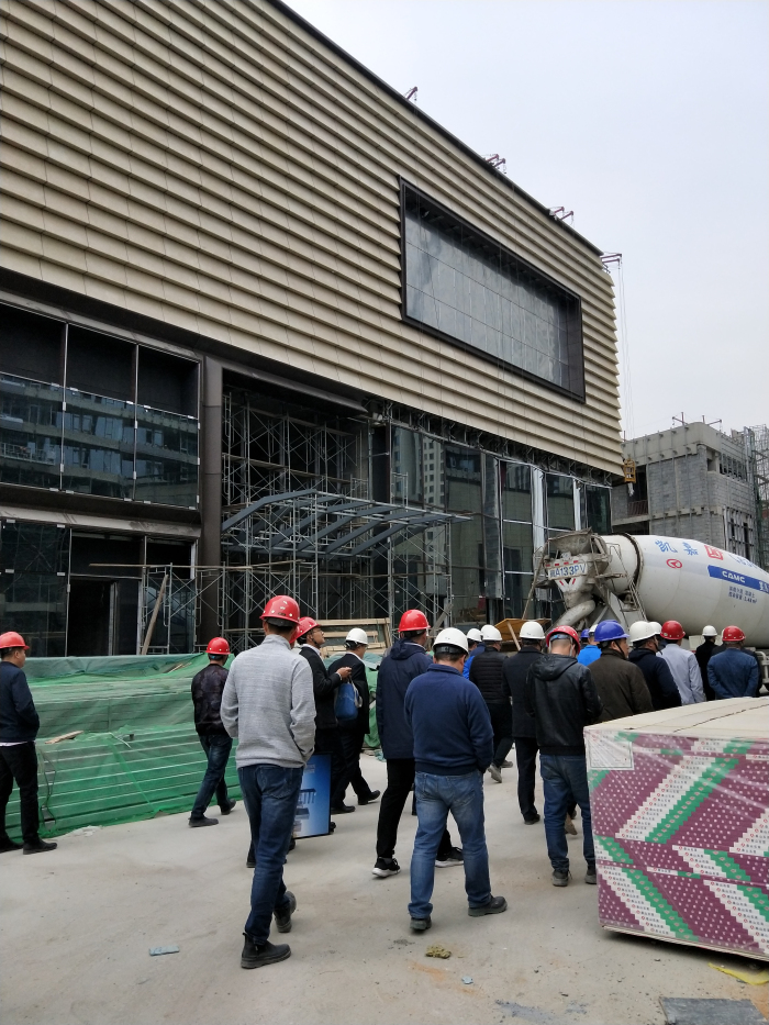 丁總一行在建藝集團等項目工程人員的陪同下,詳細了解了項目整體施工情況,并對項目幕墻、樣板區(qū)等區(qū)域的實際裝修進展情況進行了考察。期間,丁總現場聽取工程人員匯報,項目人員向丁總展示并介紹了我司施工技術亮點和項目部分施工效果。