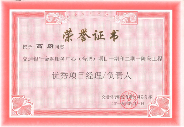 建藝集團(tuán)安徽公司負(fù)責(zé)人高蔚——“優(yōu)秀項目經(jīng)理負(fù)責(zé)人”獎