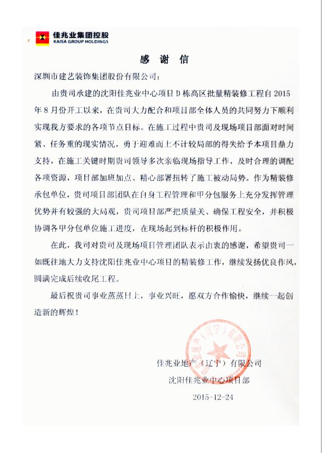一封關(guān)于沈陽(yáng)佳兆業(yè)中心項(xiàng)目的表?yè)P(yáng)信
