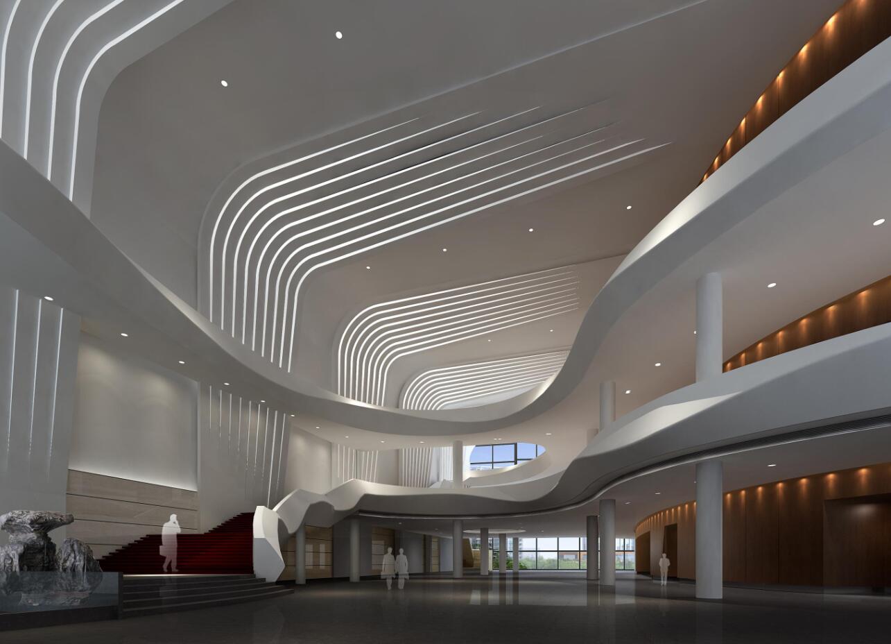 安徽廣電新中心西區(qū)大堂的室內(nèi)設(shè)計是整體建筑中最具代表性的空間設(shè)計,大堂建筑空間恢宏大氣,三層空間挑高高達23米,主廳呈U形布局,三層流線型的回馬長廊貫穿之中,設(shè)計師充分挖掘了材質(zhì)的特點,GRG材料造型欄板,打破了攔河給人的固有印象,創(chuàng)造性地使其展現(xiàn)扭曲變化的“韌性”造型,用抽象雕塑的手法表現(xiàn)了穿云破霧的“行龍”,仿佛有一種呼嘯著從遠處側(cè)廳奔騰而至的生命力,橫貫穿行在各空間里,充滿靈動和奮進的張力;體現(xiàn)出一種自由飄逸、奔放磅礴的氣勢;而與之呼應(yīng)的是在側(cè)墻上三面巨大而舒展的翅形設(shè)計,暗藏的LED燈帶輝映其側(cè),抽象地提煉出吉祥鳥“鳳凰”的翅膀形態(tài),其與橫向穿行的“行龍”在豎向上相呼應(yīng),表現(xiàn)出一種龍興鳳舉、龍鳳呈祥的戲劇性效果,設(shè)計師通過對中國傳統(tǒng)元素的提煉及概括性的演繹,用現(xiàn)代、時尚的語素去表達主題,在空間視覺上給人強烈的沖擊力。