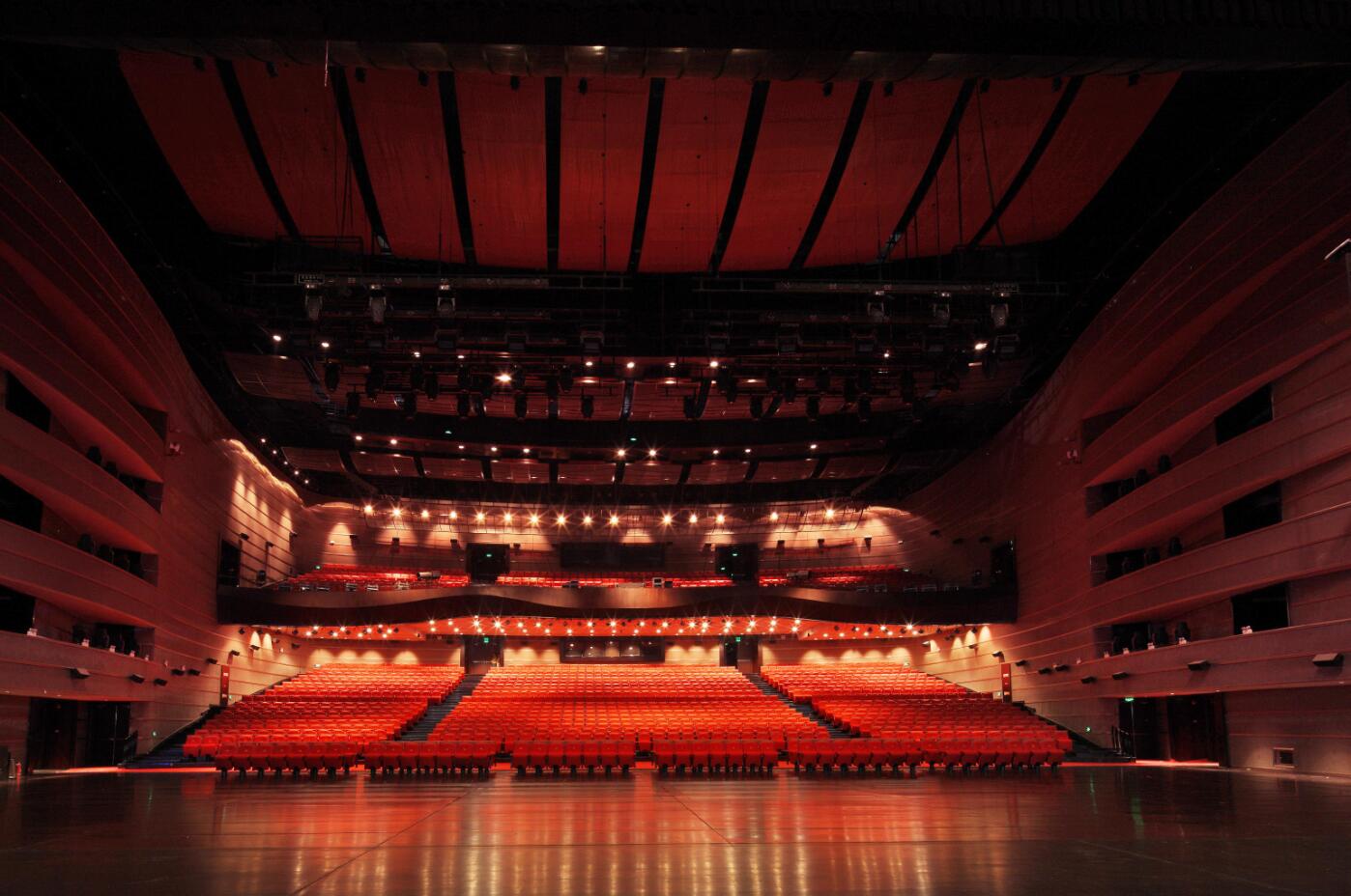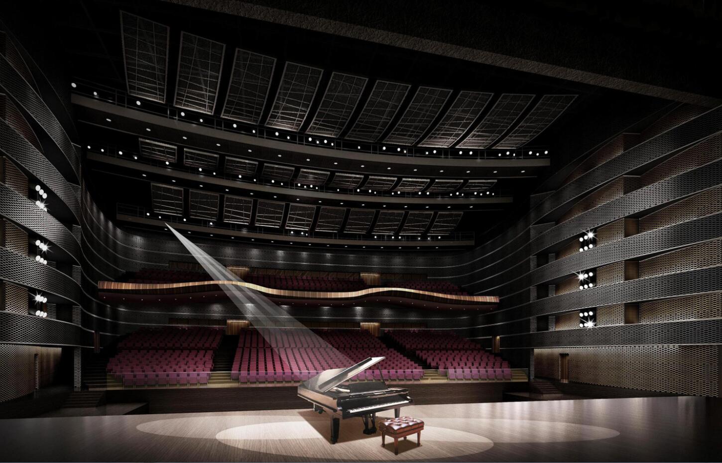 西區(qū)多功能演播廳是目前亞洲最大的專業(yè)演播廳,其專業(yè)舞臺面積達3600㎡,觀眾席1800座,其中固定坐席300座,劇場面積約9000㎡。運用了香檳色的剛質(zhì)金屬張立構(gòu)造網(wǎng)來作為主立面表層裝飾主材,大氣而舒展,其良好的穿透性,保證了其后面聲設(shè)計構(gòu)造作用的最大發(fā)揮,使聲音的吸收與反射結(jié)構(gòu)都巧妙地隱藏在統(tǒng)一的網(wǎng)層下,在立面上形成獨特的雙表皮裝飾造構(gòu),紅色的聲學造構(gòu)內(nèi)襯與香檳的金屬網(wǎng)在燈光的映射下,從不同角度折射出不同的光暈表情,使室內(nèi)空間充滿韻味。在天花的裝飾設(shè)計上,同樣遵循了聲學設(shè)計的要求,在保證空場混響時間指標的前提下你在反射區(qū)域和吸收區(qū)域巧妙地進行裝飾,使用弧型的鋁質(zhì)張立網(wǎng)懸吊構(gòu)造,其黑色輕盈的造型與紅色厚重的GRG聲學反射板相融合,讓觀者在視覺與感觀上產(chǎn)生一種沖撞與對比的感受,并且兩種形態(tài)又能很好的融合在整體的天花造型中,實現(xiàn)了天花裝飾設(shè)計上功能性與美觀性的和諧統(tǒng)一。