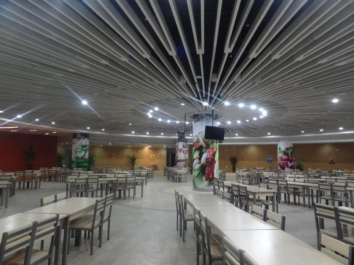 員工餐廳及辦公樓各樓層區(qū)域在設(shè)計上大量使用環(huán)保節(jié)能的材料,做到低材廣用,大氣簡約,又在大整體中見細節(jié)的精致。地面為拼花橡膠地板,頂面為圓形鋁方通造型頂,活潑的照明方式、相呼應(yīng)的造型吊頂,讓員工在用餐之余,有不一樣的視覺體驗。