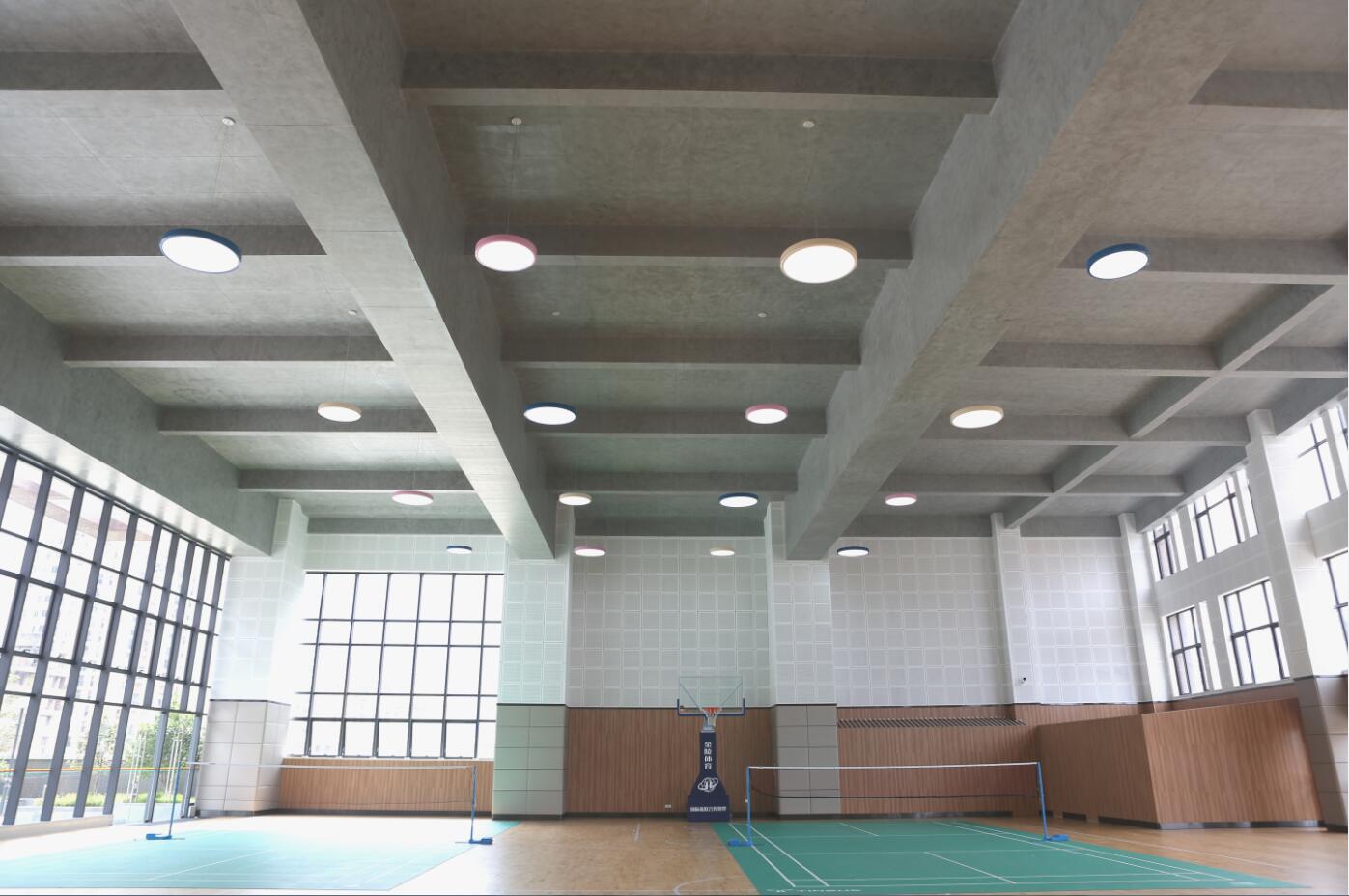 多功能廳頂面采用菱形吸音板造型獨特,每塊板單獨下料,立體拼裝,拼縫細致,聲學效果突出;多功能廳屋面為種植屋面,體現(xiàn)綠色建筑理念;風雨操場二層及屋面跨度為34.4米,最大層高10.2米,風雨操場地面采用體育專用實木地板,光潔平整,接縫嚴密;墻面采用木質(zhì)吸音板及石膏吸音板,石膏吸音板擁有自重輕、剛度好等特點,完全滿足設(shè)計吸音效果;天花采用一種清水混凝土施工工藝,施工中我們采用徒手拍擊的施工方法,形成獨特的圖案,每一塊板上的花紋都獨一無二,卻又和諧統(tǒng)一。
