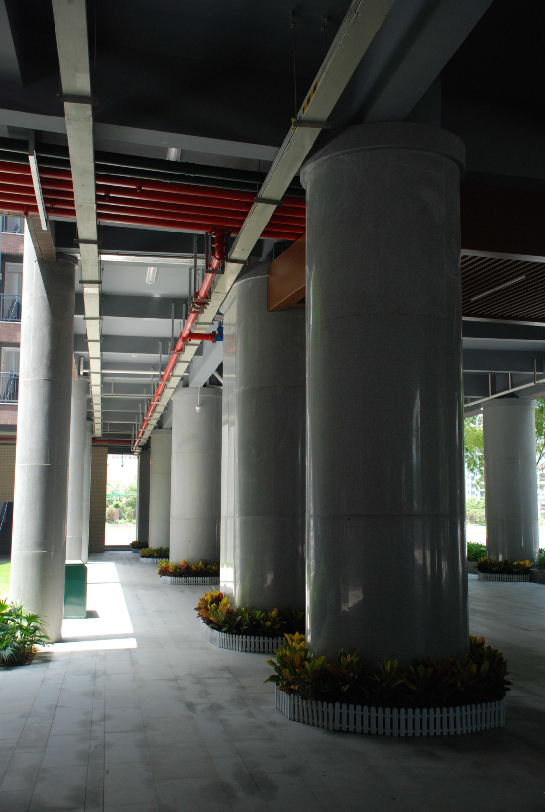 本工程主要特色與亮點是:2600平方米教學樓架空層層高5.8米,地面采用火燒面花崗石材鋪設(shè);架空層圓柱采用花崗石石材干掛包柱飾面,且所有石材工程采用電腦排版,工廠編號加工并于工廠試拼。在無任何問題后,方運至現(xiàn)場組裝。在石材質(zhì)量方面,建藝集團則嚴格要求石材色澤一致,表面光滑平整,接縫嚴密,不同材料銜接力求精準美觀。