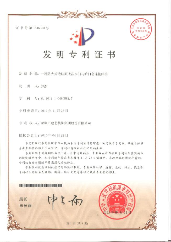 建藝集團(tuán)“一種防火折邊貼面成品木門(mén)與暗門(mén)套連接結(jié)構(gòu)”發(fā)明專(zhuān)利證書(shū)