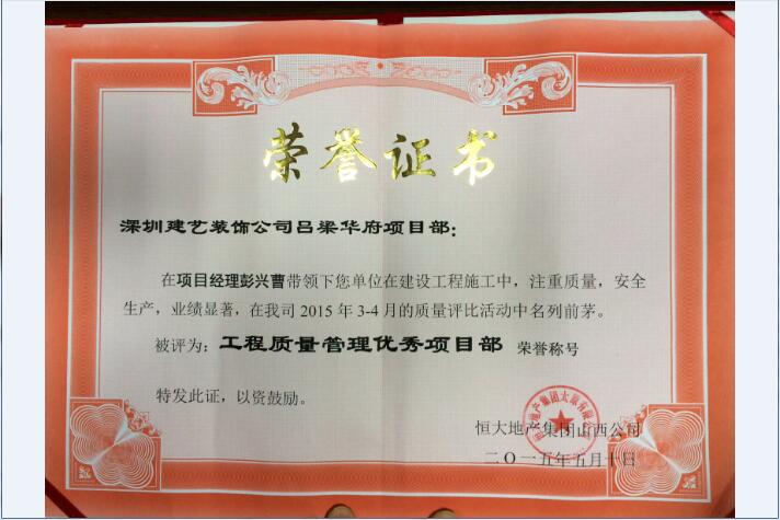 建藝集團(tuán)恒大項(xiàng)目部獲“工程質(zhì)量管理優(yōu)秀項(xiàng)目部”榮譽(yù)稱號(hào)
