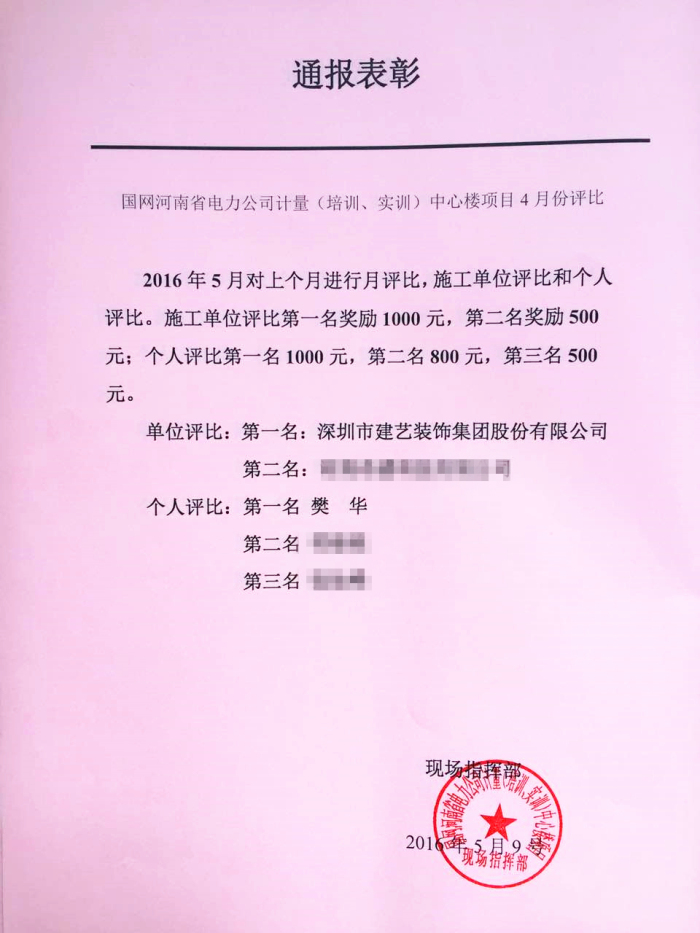 建藝集團(tuán)項目部在國網(wǎng)河南省電力公司計量(培訓(xùn)、實訓(xùn))中心樓項目施工進(jìn)度考核中成績優(yōu)異,完成了電力公司對各施工單位的考核節(jié)點任務(wù),獲得“先進(jìn)集體”獎勵及“先進(jìn)項目經(jīng)理”個人獎勵。
