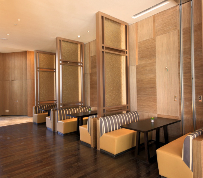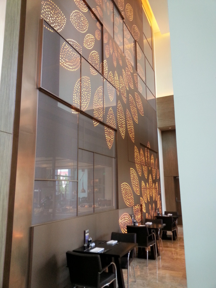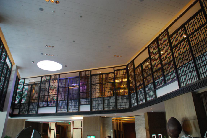 大堂咖啡廳和全日餐廳采用了金箔亞克力屏風(fēng)裝飾。這種屏風(fēng)是在二片亞克力板中間加入大量的金箔小方片后壓制而成。由于金箔小片呈無規(guī)則分布狀態(tài),故每一塊屏風(fēng)隨著光線的變換均呈現(xiàn)不同的折射效果,裝飾效果極佳。該種材料市面上較為少見,售價較高。