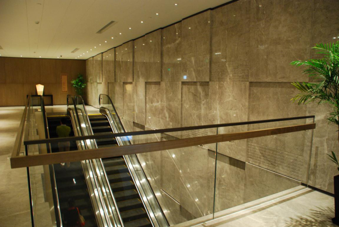 大堂自動扶梯旁的裝飾墻面高度達7.5米,采用不規(guī)則藝術(shù)造型石材墻面施工工藝。在造型中把面加進了一定量的維度,如凸出一些、凹進一些,產(chǎn)生半立體之感,造成空間流動效果,增強空間的柔美、親切的氣氛感,給人以富麗堂皇、豪華之感,產(chǎn)生強烈的藝術(shù)感染力。