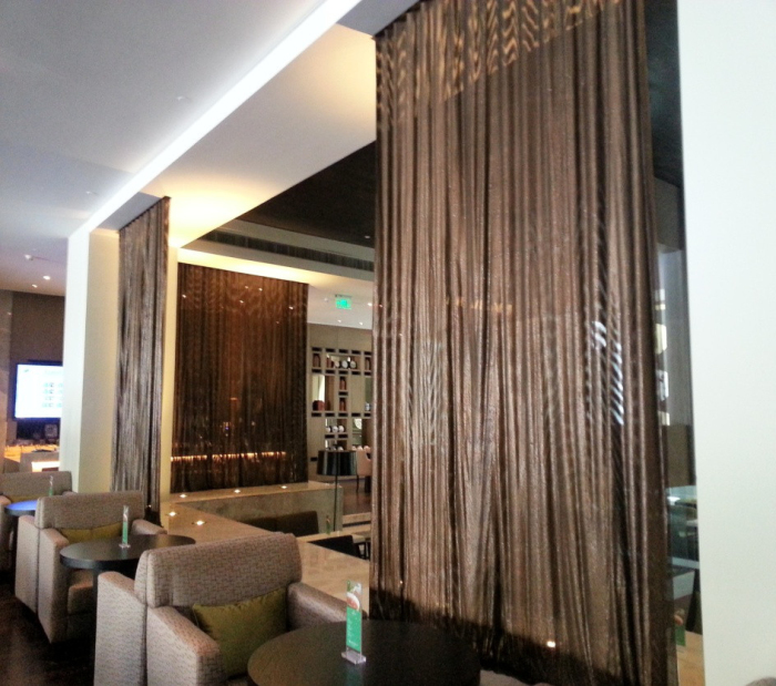 大堂吧區(qū)域采用了純金屬制作的掛簾。該掛簾不同于市面上一般的網(wǎng)狀金屬簾,是由無數(shù)的金屬小圓片串聯(lián)而成,配合掛簾軌道,可以像一般布簾一樣左右拉伸。該掛簾既有布料的柔軟度,又兼有金屬的光澤度。配合射燈的使用,給室內(nèi)裝飾帶來金碧輝煌的效果。