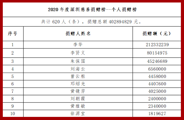 《深圳慈善捐贈榜(個人捐贈榜)》前10名