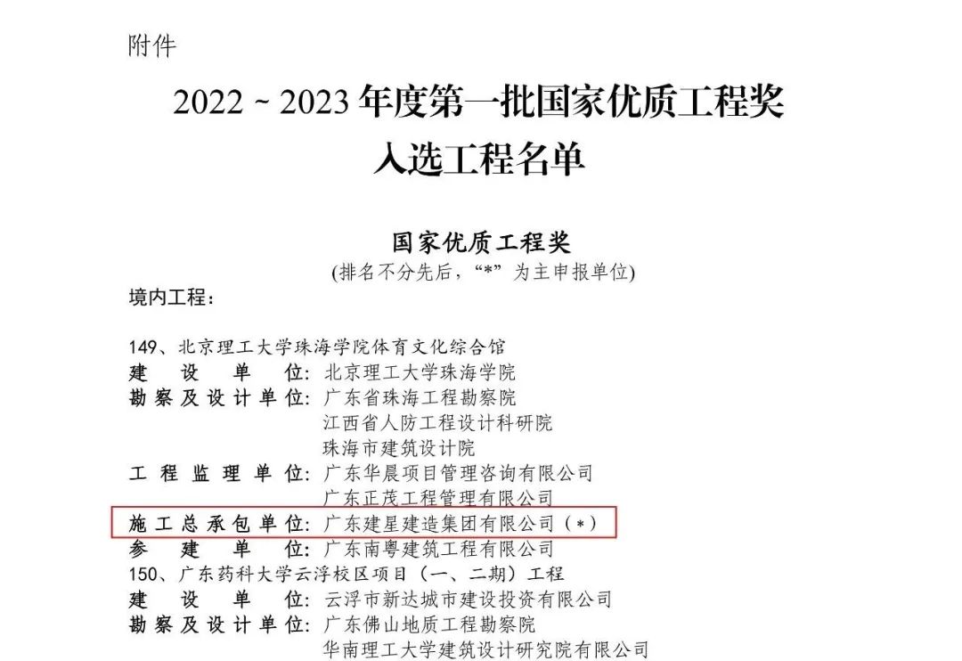 近日,2022—2023年度第一批國家優(yōu)質(zhì)工程獎(jiǎng)評選結(jié)果揭曉,由建藝集團(tuán)旗下建星集團(tuán)承建的北京理工大學(xué)珠海學(xué)院體育文化綜合館工程榮獲“國家優(yōu)質(zhì)工程獎(jiǎng)”。