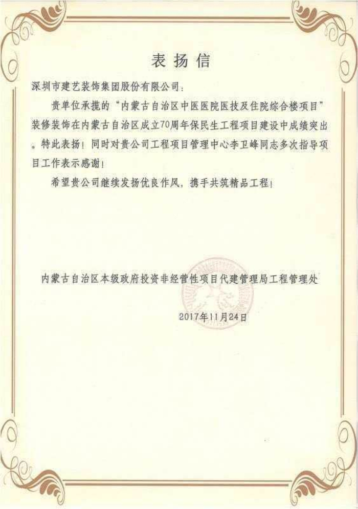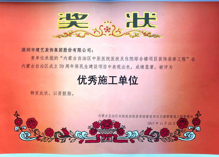 近日,由建藝集團(tuán)承建的內(nèi)蒙古自治區(qū)中醫(yī)醫(yī)院醫(yī)技及住院綜合樓項目裝飾裝修工程順利交付。該項目作為內(nèi)蒙古自治區(qū)成立70周年保民生建設(shè)項目,我司在該項目建設(shè)過程中憑借精湛的施工技藝及優(yōu)秀的項目管理,被內(nèi)蒙古自治區(qū)本級政府投資非經(jīng)營性項目代建管理局評為優(yōu)秀施工單位。同時,工程管理中心李衛(wèi)鋒在項目建設(shè)過程中,充分發(fā)揚(yáng)了建藝人求真務(wù)實、盡職盡責(zé)的優(yōu)良作風(fēng),獲得內(nèi)蒙古自治區(qū)本級政府投資非經(jīng)營性項目代建管理局的通報表揚(yáng)。