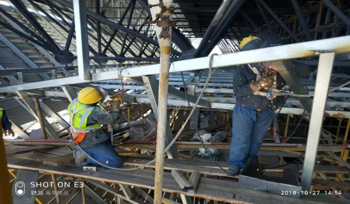 在施工過程中,有關該工程技術上的創(chuàng)新層面,樊華向我們介紹道:“山西太原濱河體育中心改擴建工程施工過程中,由于建筑物的屋頂主體是大跨度的網(wǎng)架結構,存在外力荷載作用,網(wǎng)架變形的實際情況。項目經(jīng)理鐘正成在深化設計中,采用了雙向鉸接機構,既可傳遞幕墻水平荷載,又可適應屋面的位移,在幕墻與屋面隔墻間采用風琴橡膠板連接,一方面可保證幕墻的密封性能,另一方面可保證幕墻面板不被屋面較大的變形所破壞。鋼架底部的柱腳也在深化設計中既考慮了水平荷載和豎向荷載的安全功能性,又兼顧了室內外的美觀性,采用了鉸接連接與焊接相結合的工藝,此項設計得到了建設單位及設計院的一致認可并給予高度贊揚?!?/span>
