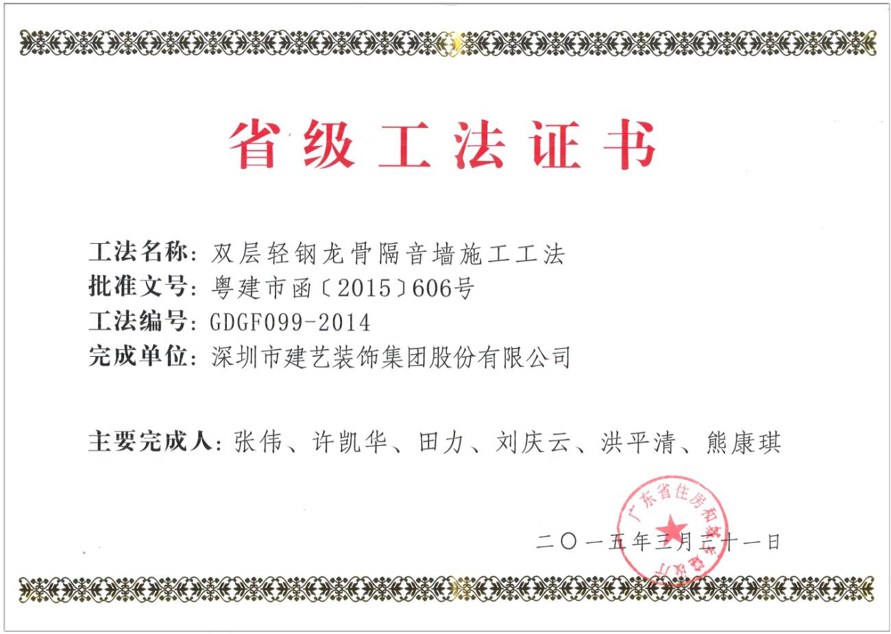 建藝集團(tuán)“雙層輕鋼龍骨隔音墻施工工法”省級(jí)工法證書